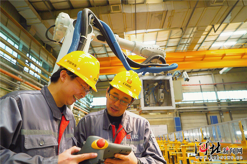 近日,中車唐山機(jī)車車輛有限公司鋁合金廠高級(jí)技師張雪松(右)和同事調(diào)試動(dòng)車組鋁合金車體側(cè)墻焊縫自動(dòng)打磨機(jī)器人。記者劉禹彤?dāng)z