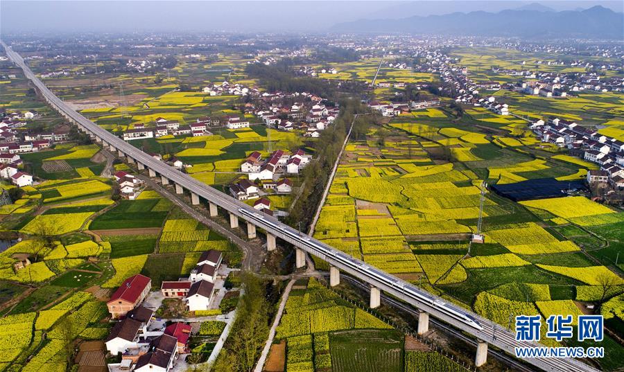 3月21日,一列動(dòng)車正通過陜西省漢中市南鄭縣新集鎮(zhèn)油菜花海(無人機(jī)拍攝)。新華社記者陶明攝