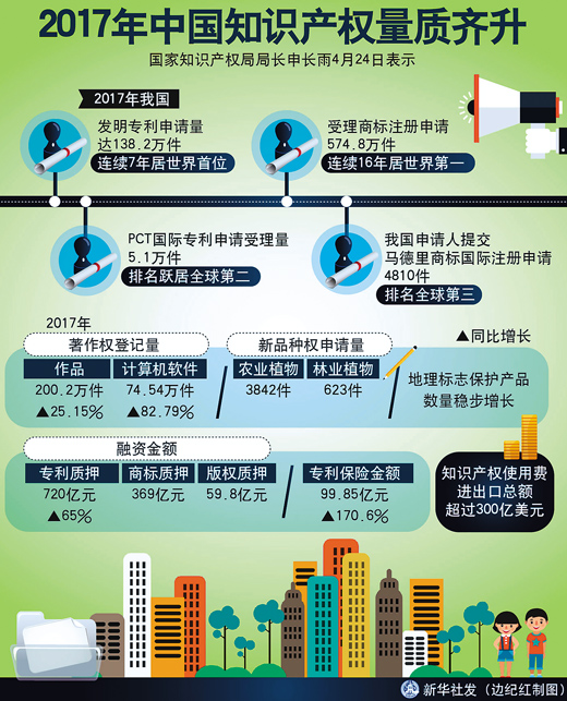 隨著中國經(jīng)濟迅速發(fā)展和創(chuàng)新能力的提高,加強知識產(chǎn)權(quán)保護愈加顯得迫切。對此,不僅外資企業(yè)有要求,中國企業(yè)更有要求。2017年,中國國家知識產(chǎn)權(quán)局共受理發(fā)明專利申請138.2萬件,其中國內(nèi)申請超過90%;商標申請量達到574.8萬件,其中國內(nèi)申請量占到96.36%,顯示了國內(nèi)市場主體和創(chuàng)新主體對加強知識產(chǎn)權(quán)保護的強烈需求。