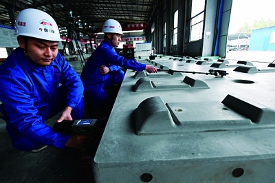 CRTSⅢ型先張法預應力混凝土軌道板是我國自主研發(fā)、具有完全自主知識產(chǎn)權(quán)的一項重大科技成果。圖為工作人員給CRTSⅢ型先張法軌道板進行激光打碼。新華社記者 宋振平攝